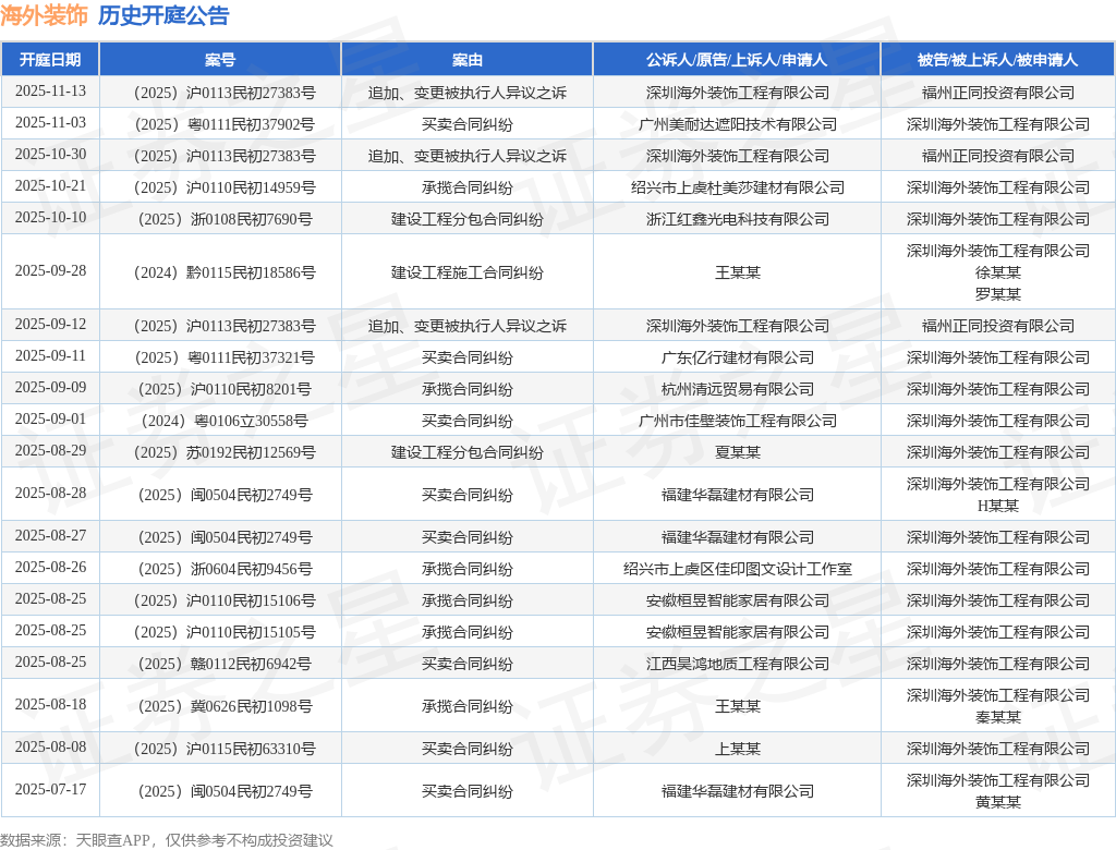 根据统计,近一年内以深圳海外装饰工程有限公司为当事人的历史开庭公告有94则,其中案由为“买卖合同纠纷”的公告以43则居首,其次为“建设工程分包合同纠纷”有15则,“承揽合同纠纷”有13则。历史开庭公告(前20条)如下: